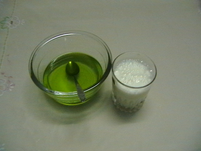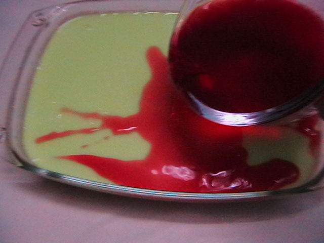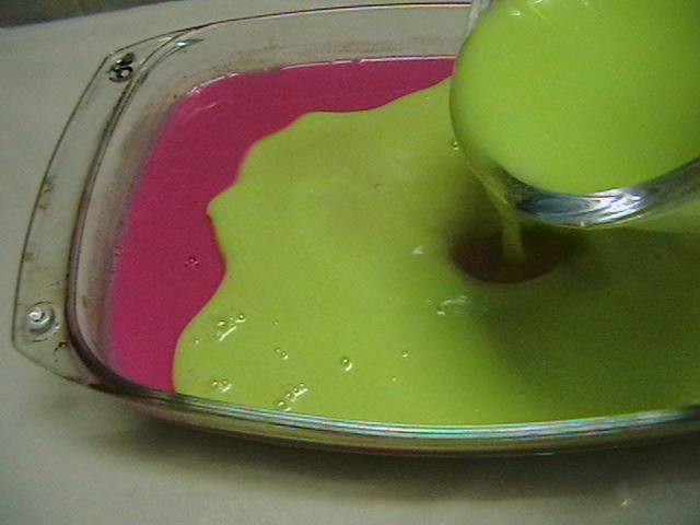 در مرحله بعدی من از رنگ سبز استفاده کردم ولی هنگام مخلوط با شیر سبز خیلی کمرنگ می شود که در مواردی با زرد خیلی تفاوت ندارد شما می توانید یک در میان از ژله شفاف و یاشیر استفاده کنید
