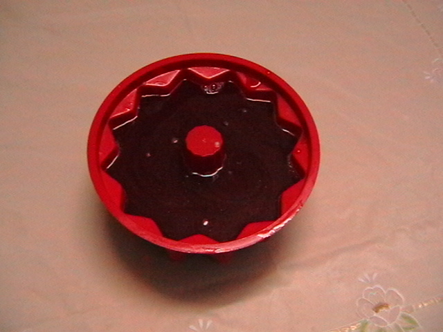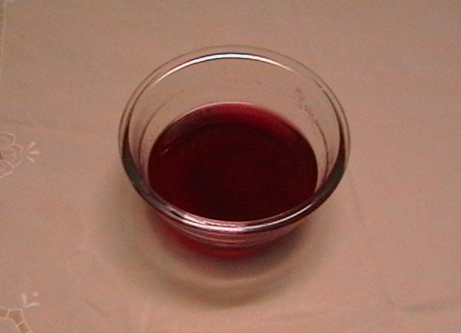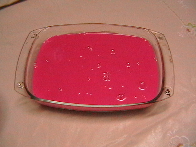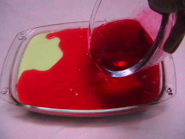 در این مرحله از رنگ قرمز شفاف استفاده می کنم یعنی چودر ژله را با یک لیوان آب جوش حل کرده و سپس کمتر از یک لیوان آب سرد به آن اضافه می کنم