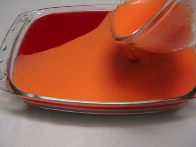 در هنگام درست کردن ژله های چند رنگ به خاطر داشته باشید هر رنگ حتما باید سفت شود تا هنگام اضافه کردن رنگ دوم دو رنگ با هم مخلوط نشود
